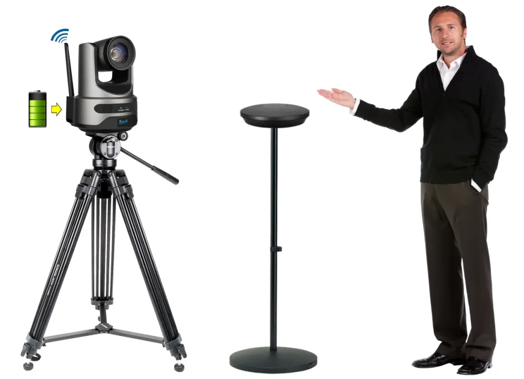 Live Streaming Kamera CR60W wireless mit KI Tracking Funktion integrierte Lithium Batterie mit wireless Betrieb bis 6 Stunden, optional Batteriesystem anschliessbar.